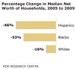 Median household wealth among Hispanics fell from $18,359 in 2005 to $6,325 in 2009. The percentage drop—66%—was the largest among all racial and ethnic groups, according to anew report by the Pew Research Center’s Social & Demographic Trends project. During the same period, median household wealth declined 53% among black households and 16% among white households…