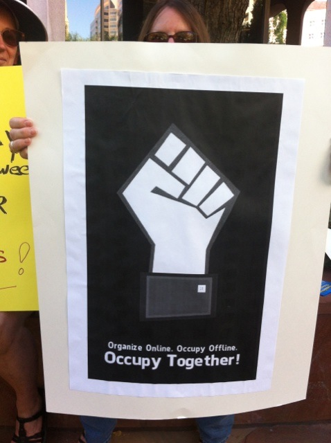 When the #occupy movement came to Phoenix on October 15 to Ceasar Chavez Plaza my wife and I decided to go downtown and support the 99%. We were cautiously optimistic of what the overall message would be. The Phoenix Police Department were giving protesters their space and respectful at the same time even in the face of aggressive opposition. A young man who got a hold of a bull horn started to hatespeak our police officers. Saying that we don’t need cops and they only harass people. To take out our cell phones and record whenever you see someone getting pulled over or talked to by a cop because that would deter them from… from what? Not sure, because a cop came up and asked him if he had a gun in his pocket (I was well within viewing range of his pocket and I couldn’t discern what it was but it did look like the wooden handle of a gun). When he refused to answer they asked him to leave the plaza (about 10 feet away from where he was standing) as it was illegal to carry fire arms within a plaza. He spoke a few more epithets against the police and then was off walking the streets.