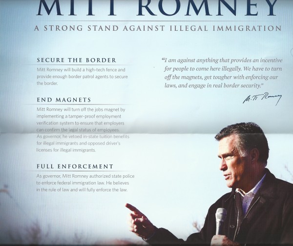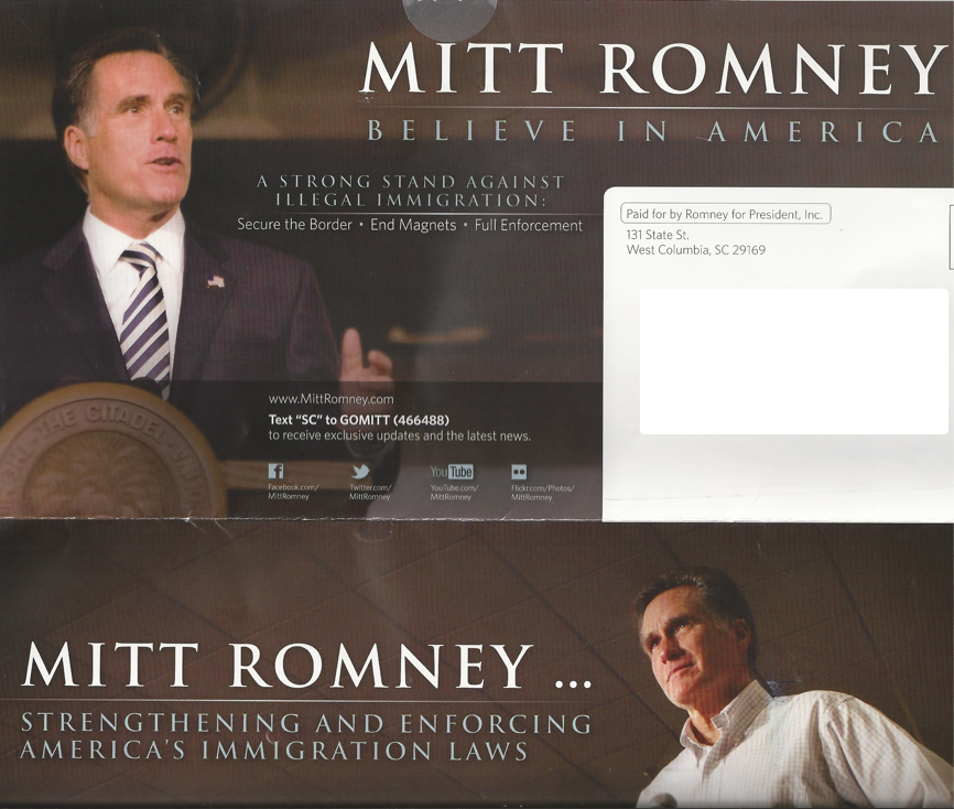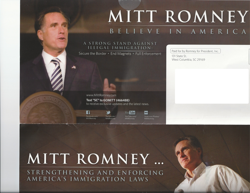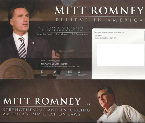 Chisme Mary Mata January 5, 2012 Romney Uses Anti-Immigrant Mailers To Campaign In South Carolina Share Tweet LinkedIn Text: + - We got a hot tip that Mitt Romney is using his anti-immigrant stances to campaign to potential voters in South Carolina. See the two sides of a mailer below.Then there’s this: Related