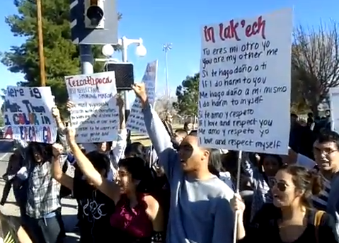 They left school around 9am met at Santa Rita Park and marched to Tucson Unified School District (TUSD) hand in hand. The schools averaged about 2 to 3 miles away from the park and it was about 1.5 miles to TUSD. The effort was sparked last night (Sunday) via social media. At TUSD they listed demands to the district which included the reinstatement of MAS class, chanted and created critical dialogue among themselves. They chanted, “Sí se puede, sí si se puede” and “When our education is under attack, what do we do? Take it back!” [And] the students also recited “In Lak’ech'” several times.