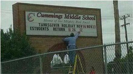 According to reports, officials at Cummings Middle School confirmed that the sign was real and that someone took a picture of it and posted it on Facebook before it was corrected. Most of the comments mocked the picture for a laugh, although some comments were more serious:
