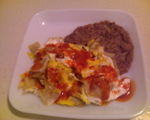 Basic migas with refried pintos (for the bean recipe, click here). Â I didn’t even put onion in these puppies, just egg, tortillas, sal y pimienta with a little Tapatío for good measure. See? Vegetarianism can be scrumptious! What’s your favorite migas recipe?