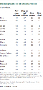 Among the 2,691 adults surveyed by the Pew Research Center from Oct. 1-21, 2010, 42% say they have at least one step relative. Three-in-ten have a step or half sibling, 18% have a living stepparent, and 13% have at least one stepchild.