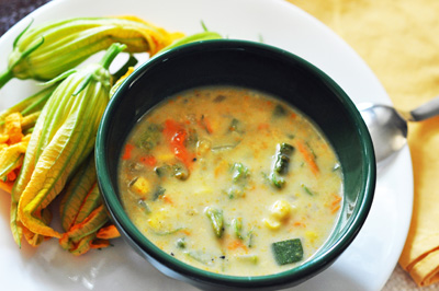 - Add the chiles to the soup along with the milk and reserved onion; bring to a simmer and cook for 10 minutes. Add the zucchini (or summer squash) and corn, simmer a couple of minutes, then add the remaining squash blossoms. Simmer a couple of minutes longer. Remove from heat, stir in the evaporated milk, taste, and season with salt and black pepper.
