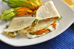 - To make the quesadilla, lay two of the tortillas on a flat surface. Distribute the cheese equally on both tortillas. Then, spread 1/2 of the squash blossom filling over the cheese. Cover with the other tortillas, place on heated griddle or nonstick saute pan with a little oil and cook for about 3 minutes on each side.