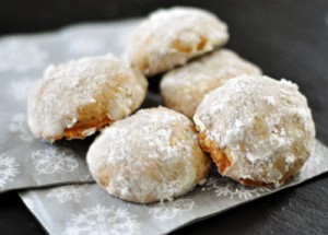 The history of this buttery, nutty cookies coated in powdered sugar is a bit of mystery, but I really don’t care. They are delicious, perfect for the holidays and any cookie exchanges taking place around this time. This recipe makes about 15, 1- cookies but go ahead and double it because they go fast!