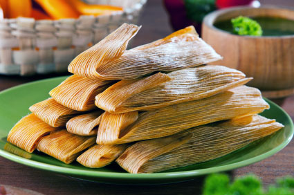 Begin by laying out one corn husk with the tapered side facing you. Spread about 1/4 to 1/3 cup of masa into the wide end forming a 4-inch square. Place 1 to 2 tablespoons of the meat and sauce mixture in the center of the masa. Fold the corn husk in half to enclose the meat, then roll the husk to seal the tamale. Fold the tapered end of the corn husk up and place the tamale seam side down on your work surface (you can have more than one corn husk to ensure the tamale does not come out while steaming). Repeat until all the tamales are made.