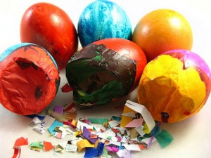- Once the eggs are dry, fill them with confetti. (Extend the fun by having kids make their own confetti, using a hole punch.)
