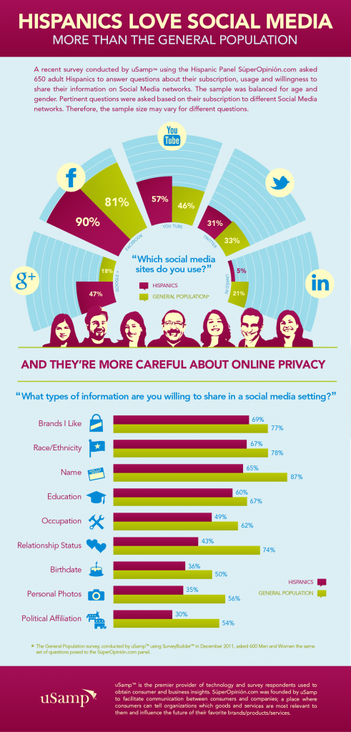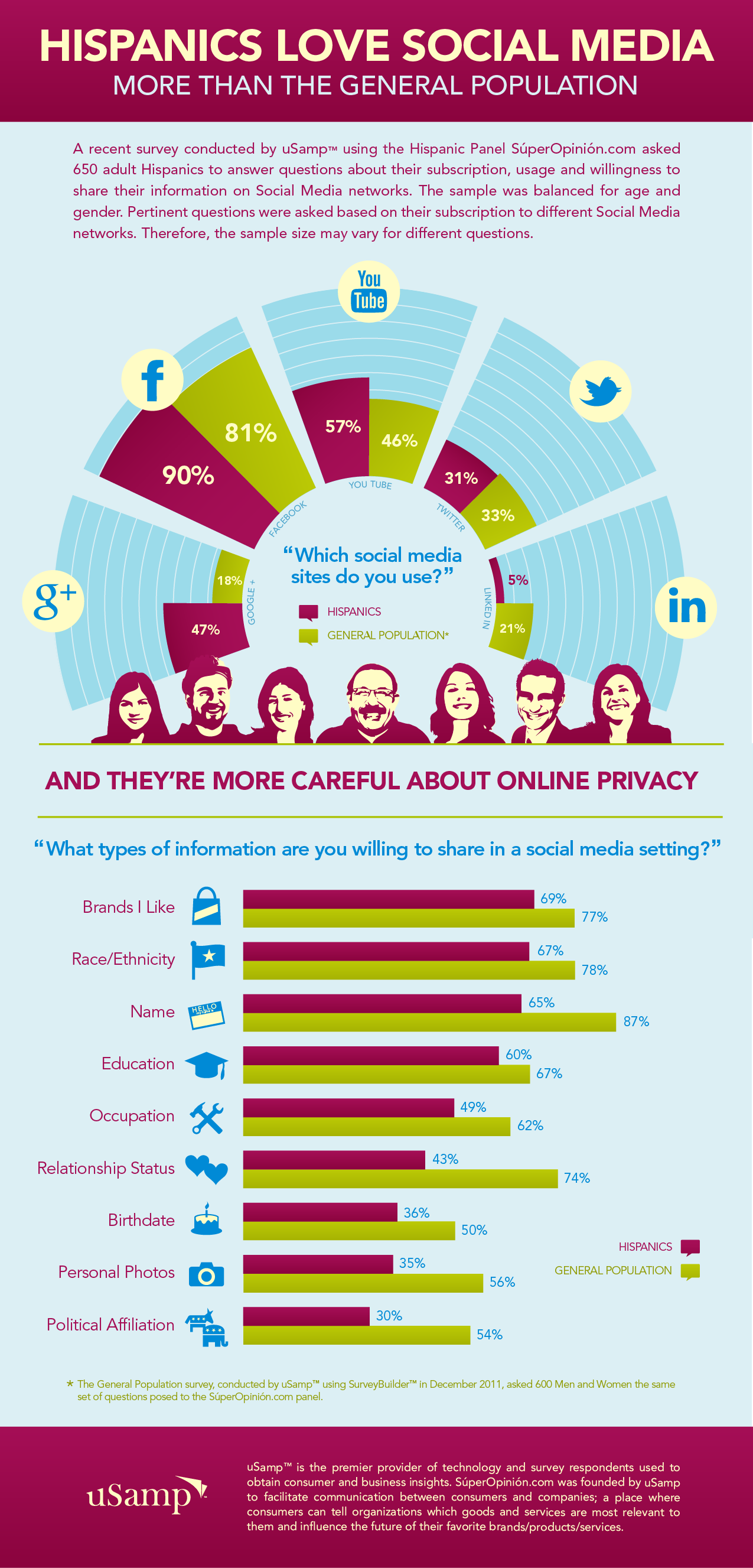 65 percent of Hispanics are willing to share their names on social media compared to 87.1 percent of the general population. Hispanics are also more reluctant to post their relationship status – only 42.5 percent vs. 73.5 percent of the general population.