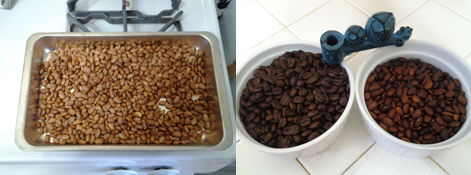 Researching the Internet, I found the process to roast coffee beans, which was applied to frijoles. I heated up the oven to 475 degrees and let it preheat. I laid out the frijoles evenly in a pan. Then the frijoles roasted for 30 minutes. About every 3 minutes or so, I mixed the frijoles so they would evenly roast. The aroma of frijoles roasting quickly filled my kitchen. It was a good smell. A delicious smell. The freckled beans began to darken into a dark brown. I removed them and let them cool.