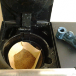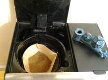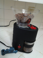 I have a conical burr grinder, which I use every morning to make freshly ground coffee beans. A conical bur grinder is mejor that a blade grinder porque the coffee beans are crushed with little friction. Thus, making the bean oils more easily extracted, making the beans taste better, smoother, and awesome. I emptied the frijoles into the conical burr grinder, which crushed them into a nice light brown coarse powder. I placed the frijoles power into my coffee maker, filled its reservoir and waited eagerly for it to brew.
