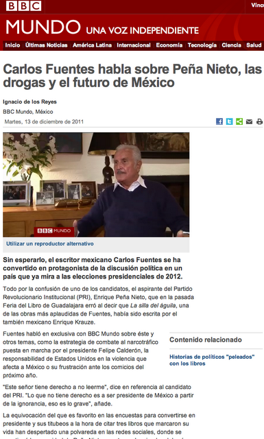 Here’s a recent BBC Mundo piece and streaming interview with Fuentes from December 2011–the streaming video appears below the imagelink.