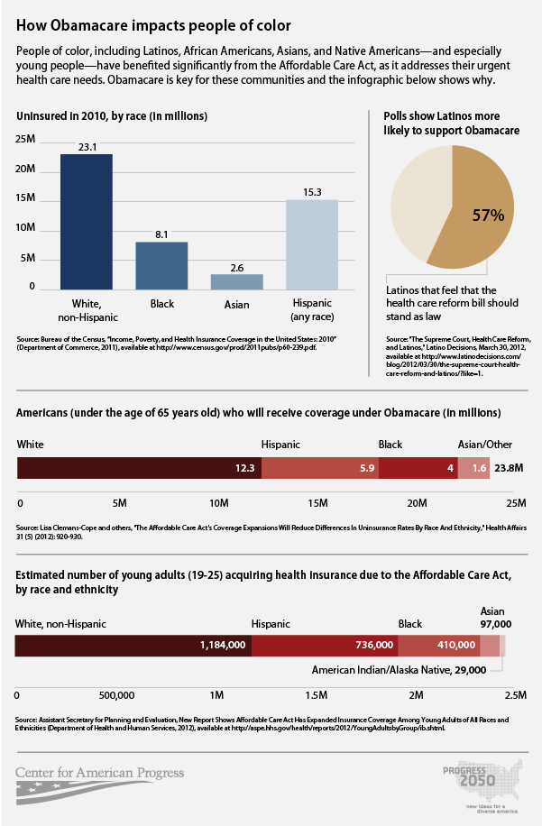 Washington, D.C.—Ahead of the Supreme Court ruling on the consitutionality of Obamacare, Progress 2050 released the following infographic showing how many people of color, including Latinos, African Americans, Asians, and Native Americans—and especially young people—have benefitted from the Affordable Care Act to address their most urgent health needs.