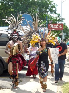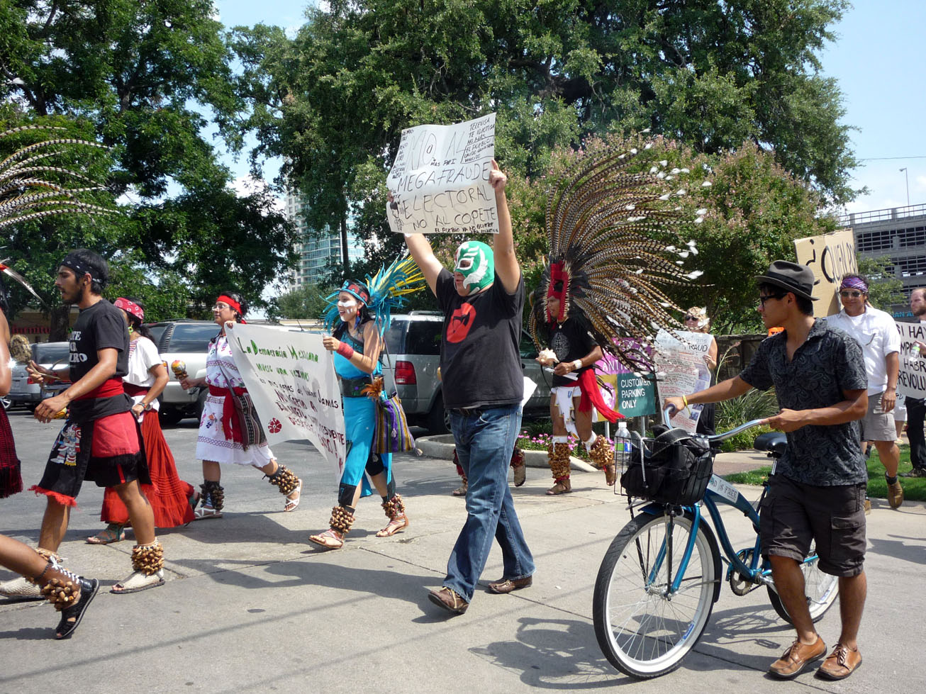 Protesters, in traditional Aztec attire and wearing colorful headdresses, marched down 6th Street toward Congress Avenue in downtown Austin Saturday afternoon. Drivers honked their support and stuck their fists out or cheered the demonstrators on. The Aztec danzantes led the march with colorful, elaborate feather headdresses and giant signs. They chanted, “Se ve, se siente, Peña es delincuente!” or “It can be seen, it can be felt, Peña [Nieto] is a criminal!”