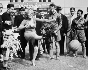 The sight of Marilyn Monroe kicking a soccer ball caught my eye. This photograph, credited to AFP, accompanied a Yahoo News story about the 50th anniversary of her death, which occurred on August 5, 1962. In the shot, the Hollywood star performs the ceremonial first kick prior to a contest between the Hapoel club of Israel and the All-Stars US team. The match took place at Brooklyn’s Ebbets Field, in 1957.