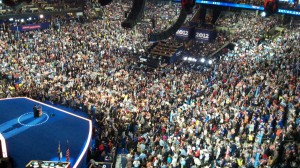 I sat perched high in the media gallery. The picture below gives you my vantage point, I was closer to the security guys roaming the rafters than I was to the delegates on the floor (click on it for a better feel of my view). But still, there was a creeping energy, building as the night progressed from opening gavel to the main events. It didn’t take much to rouse these partisans, they came to the Democratic National Convention to be roused. They were given a parade of multi-ethnic, multi-interest VIP’s that warmed the crowd – black Mayors, white union leaders, women governor’s, Latino legislators, and party luminaries.