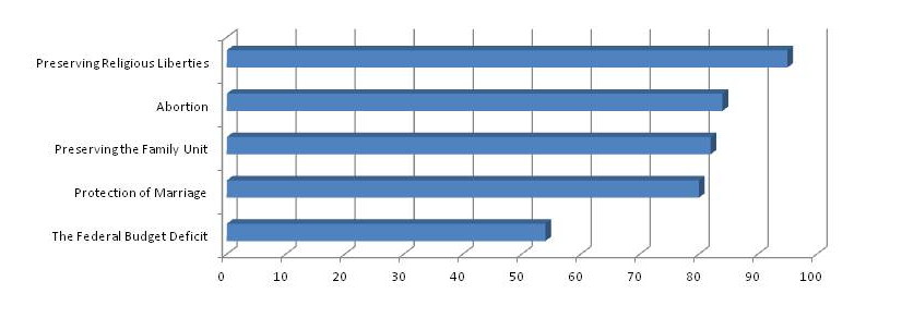CALL members’ concern about the outcome of the presidential election appeared evident in another important finding of the 2012 survey. When asked to rank the issues they considered of greatest importance to the future of the country—selecting from such topics as immigration, abortion, marriage and family, education, the deficit, and unemployment—respondents ranked religious liberty as their top priority.