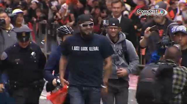 Sergio Romo Wears “I Just Look Illegal” Tee at Giants Parade