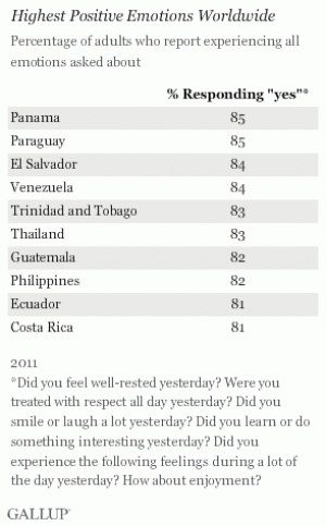 measured positive emotions in 148 countries and areas in 2011 using five questions. These questions ask people whether they experienced a lot of enjoyment the day before the survey and whether they felt respected, well-rested, laughed and smiled a lot, and did or learned something interesting.