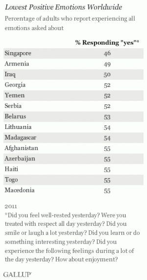 Singaporeans, Armenians, and Iraqis are least likely worldwide to report feeling positive emotions.