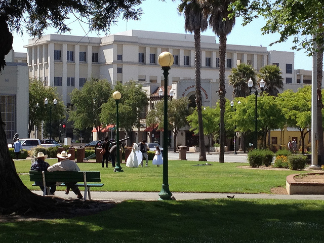 WATSONVILLE — In a grassy downtown plaza, strolling musicians wearing glitzy cowboy outfits blast a mariachi song, while Spanish-speaking shoppers bustle between farm stands, sampling tart cactus leaves, sniffing roasting chilies and buying bundles of warm pork tamales.