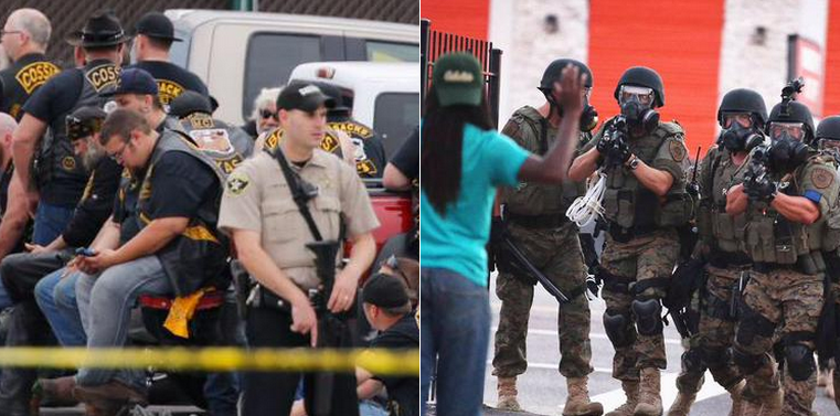 The biker gang shootout this weekend in Waco, Texas, that left nine people dead, 18 wounded, and as many as 192 facing organized crime charges has sparked a lot of scrutiny over how police and media are treating this incident compared with how they approached the protests in Ferguson, Mo., and Baltimore.