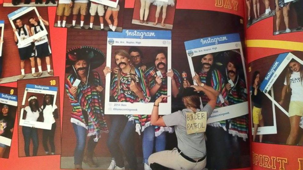 The photo, which was printed on page 96 of the $90 Naples High School yearbook in Naples, Florida, pictured six students dressed in ponchos and sombreros and wearing mustaches, and one student in a shirt labeled “border patrol.”