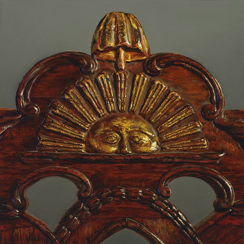 There is one exception, George Washington’s chair. It presides over the room, more than likely in the same spot where Washington sat presiding over the constitutional convention in 1787. We know this because of the detail at the center of the crest rail, a carving of a half sun with emanating rays. James Madison is quoted as saying he heard Benjamin Franklin comment on the sun – “I have often looked at that behind the president without being able to tell whether it was rising or setting. But now I… know that it is a rising…sun.”