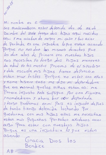 One letter reads: “I am a woman fleeing a country where women are given few rights, all of which are violated, and land in this place where the people of immigration condemn us to a process with little or no security, since this process will ultimately end with our deportation.”